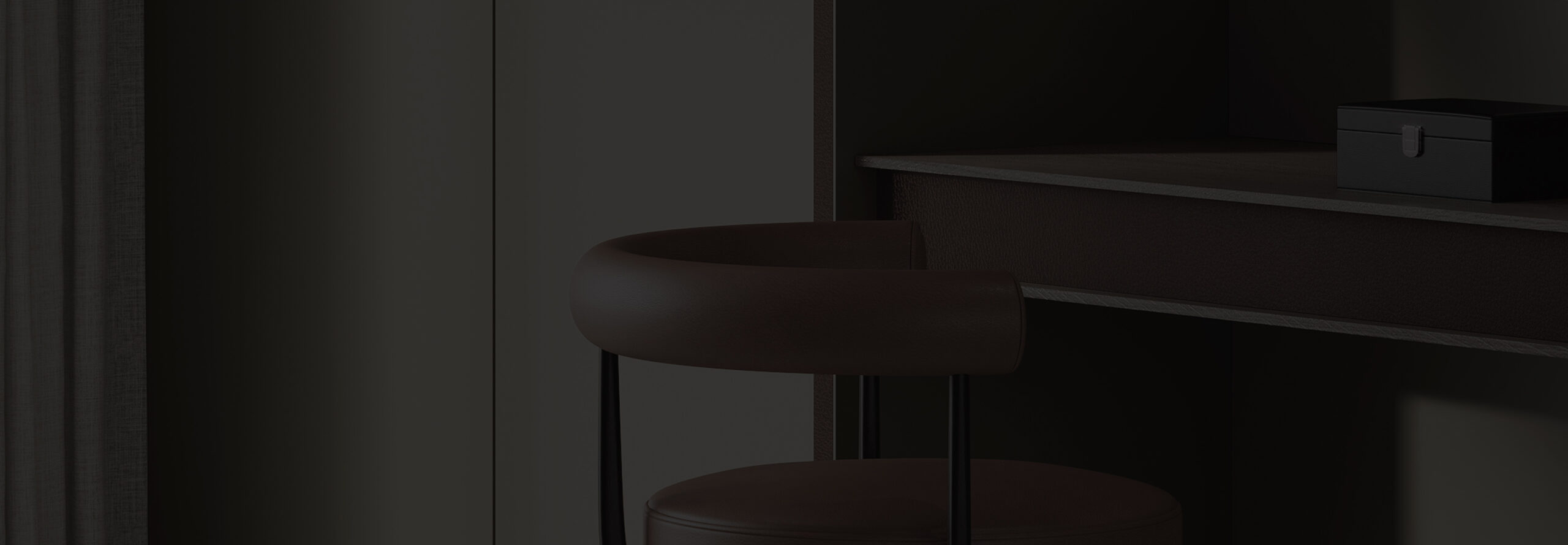 O toucador Stelo projeta-se sutilmente da parede, mantendo uma aparência leve e perfeitamente alinhada com a linguagem arquitetónica do sistema. Concebido para ser instalado com uma ligeira separação da parede, este gesto confere-lhe uma presença própria sem quebrar a continuidade do espaço. Os acabamentos refletem a sensibilidade da coleção: lacado mate no corpo principal, detalhe em pele nas laterais verticais, e frentes de gavetas em madeira natural que conferem profundidade material e calor. Cada componente foi pensado para oferecer uma experiência visual e tátil equilibrada.